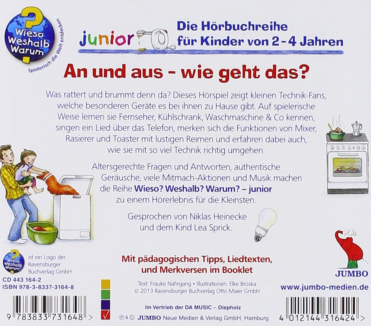 Was rattert und brummt denn da? Dieses Hörspiel zeigt kleinen Technik-Fans, welche besonderen Geräte es bei ihnen zu Hause gibt. Auf spielerische Weise lernen sie Fernseher, Kühlschrank, Waschmaschine & Co kennen, singen ein Lied über das Telefon, merken sich die Funktionen von Mixer, Rasierer und Toaster mit lustigen Reimen und erfahren dabei auch, wie sie mit so viel Technik richtig umgehen. Altersgerechte Fragen und Antworten, authentische Geräusche, viele Mitmach-Aktionen und Musik machen die Reihe "Wieso? Weshalb? Warum? junior" zu einem Hörerlebnis für die Kleinsten. Das gleichnamige Buch von Frauke Nahrgang und Elke Broska ist im Ravensburger Buchverlag erschienen.