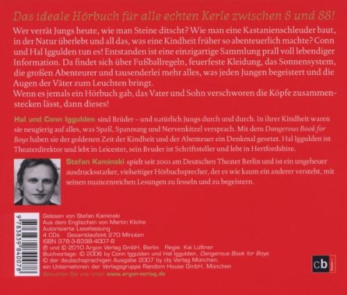 Wer verrät Jungs heute, wie man Steine ditscht? Wie man eine Kastanienschleuder baut, sein eigenes Gokart fährt und all das, was eine Kindheit früher so abenteuerlich machte? Conn und Hal Iggulden tun es! Entstanden ist ein einzigartiges Kompendium prall voll lebendiger Information. Da findet sich über Fußballregeln, Flaggencodes, das Sonnensystem, die großen Abenteurer und tausenderlei mehr alles, was jeden Jungen begeistert und die Augen der Väter zum Leuchten bringt. Wenn es jemals ein Hörbuch gab, das Jungs von Fernseher und PlayStation weglockt und Vater und Sohn verschworen die Köpfe zusammenstecken lässt, dann dieses!