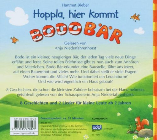 Bodo ist ein kleiner, neugieriger Bär, der jeden Tag viele neue Dinge erfährt und lernt. Seine tollen Erlebnisse gibt es nun auch zum Anhören und Miterleben. Bodo Bär erkundet eine Baustelle, fährt ans Meer, auf einen Bauernhof und vieles mehr. Und dabei stellt er viele Fragen: Woher kommt die Milch? Wie funktioniert ein Leuchtturm? Und wie wird eigentlich ein Haus gebaut?