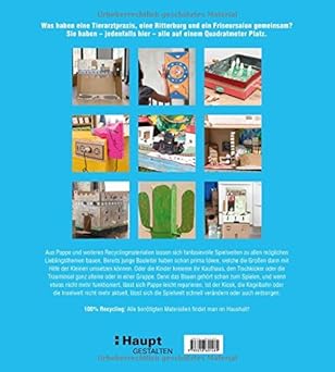Was haben eine Tierarztpraxis, eine Ritterburg und ein Friseursalon gemeinsam? Sie haben - jedenfalls hier - alle auf einem Quadratmeter Platz. Aus Pappe und weiteren Recyclingmaterialien lassen sich fantasievolle Spielwelten zu allen möglichen Lieblingsthemen bauen. Bereits junge Bauleiter haben schon prima Ideen, welche die Großen dann mit Hilfe der Kleinen umsetzen können. Oder die Kinder kreieren ihr Kaufhaus, den Tischkicker oder die Trauminsel ganz alleine oder in einer Gruppe. Denn das Bauen gehört schon zum Spielen, und wenn etwas nicht mehr funktioniert, lässt sich Pappe leicht reparieren. Ist der Kiosk, die Kegelbahn oder das Inselparadies nicht mehr aktuell, lässt sich die Spielwelt leicht verändern, verschenken oder auch entsorgen. 35 tolle Ideen für Kindern ab 5 Jahren.