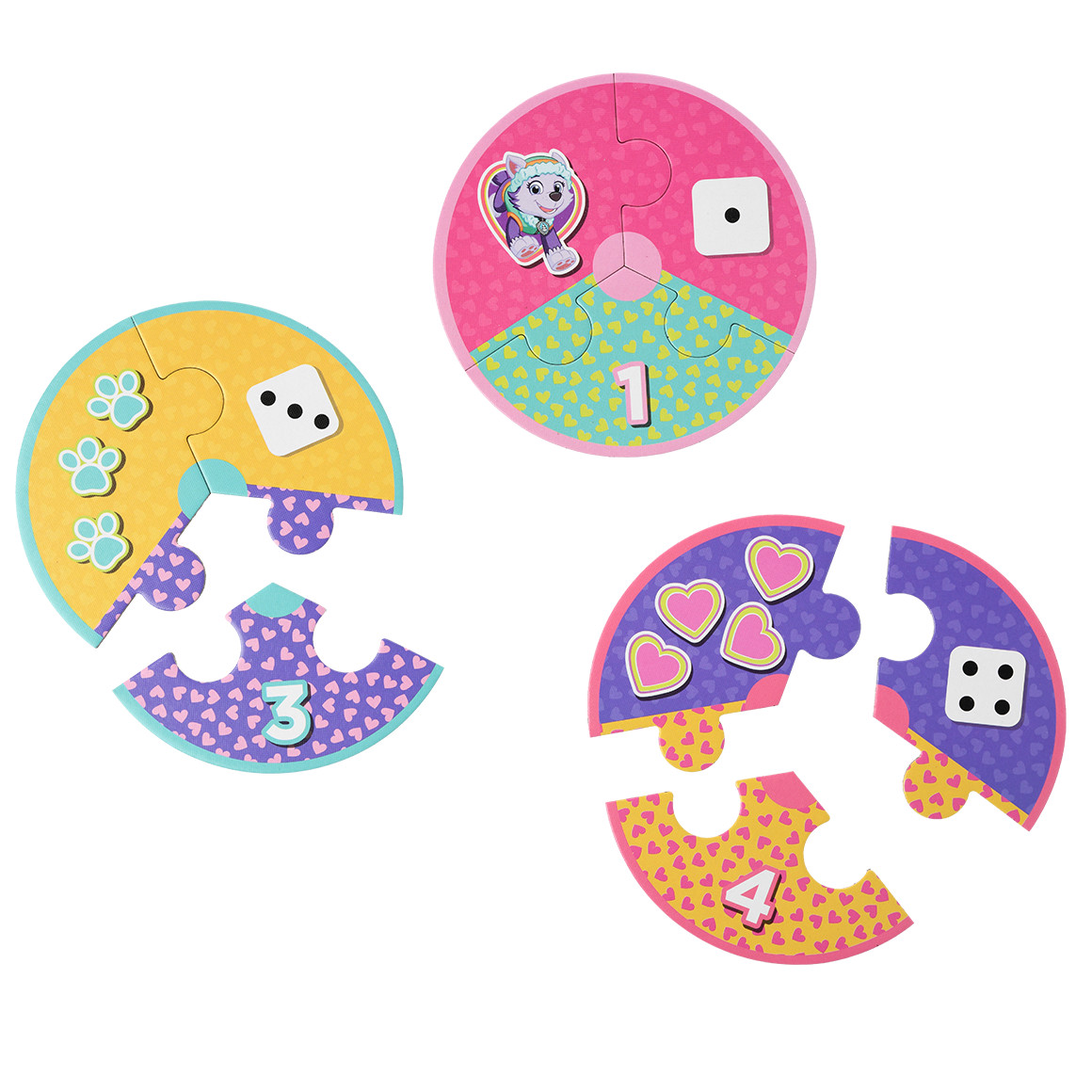 Zahlen spielerisch lernen! 10 Zahlenpuzzle von "PAW Patrol" in verschiedenen Farben. Ein Puzzle besteht jeweils aus drei Puzzleteilen mit unterschiedlichen Symbolen. Maße ca. 13,5 x 13,5 cm (BxH).
